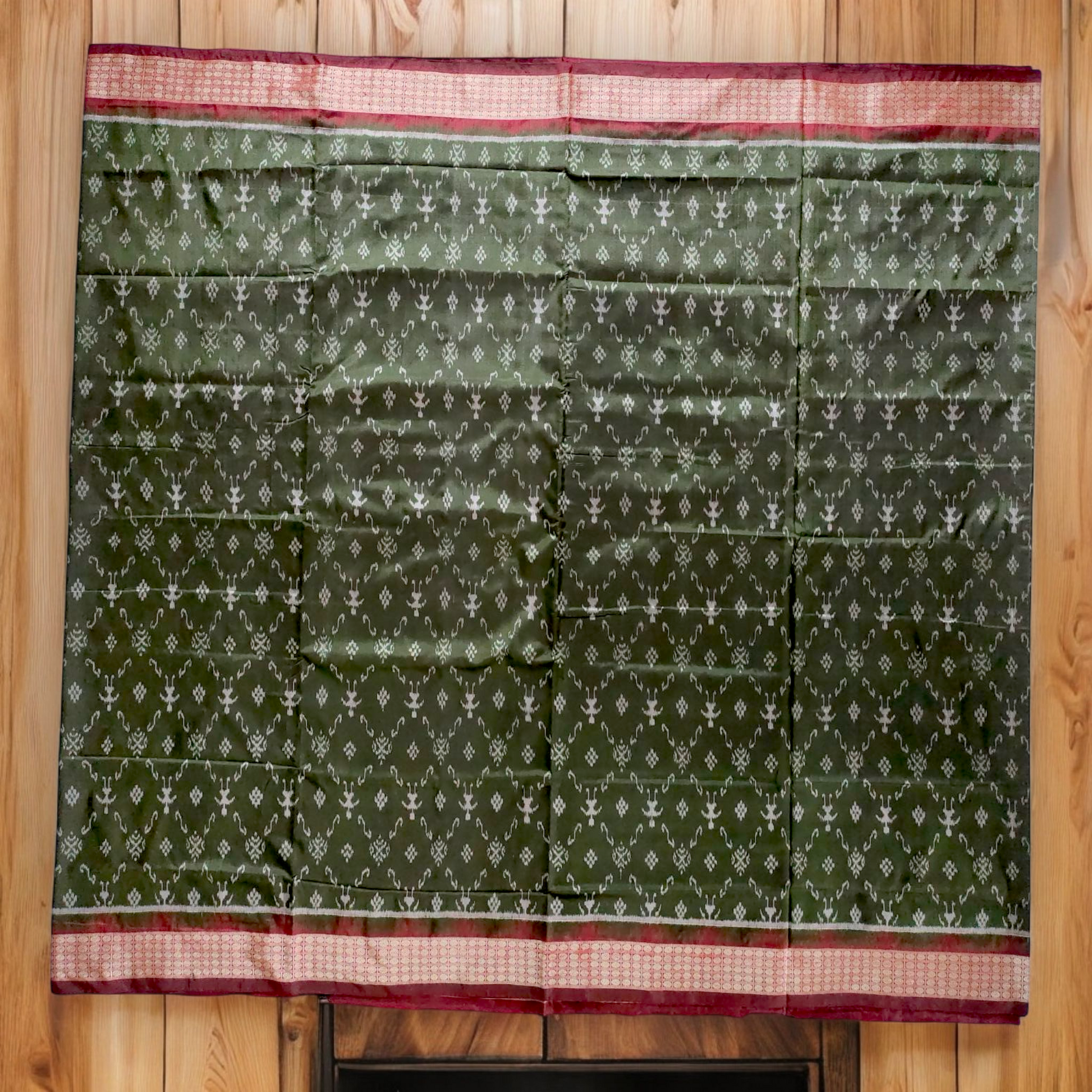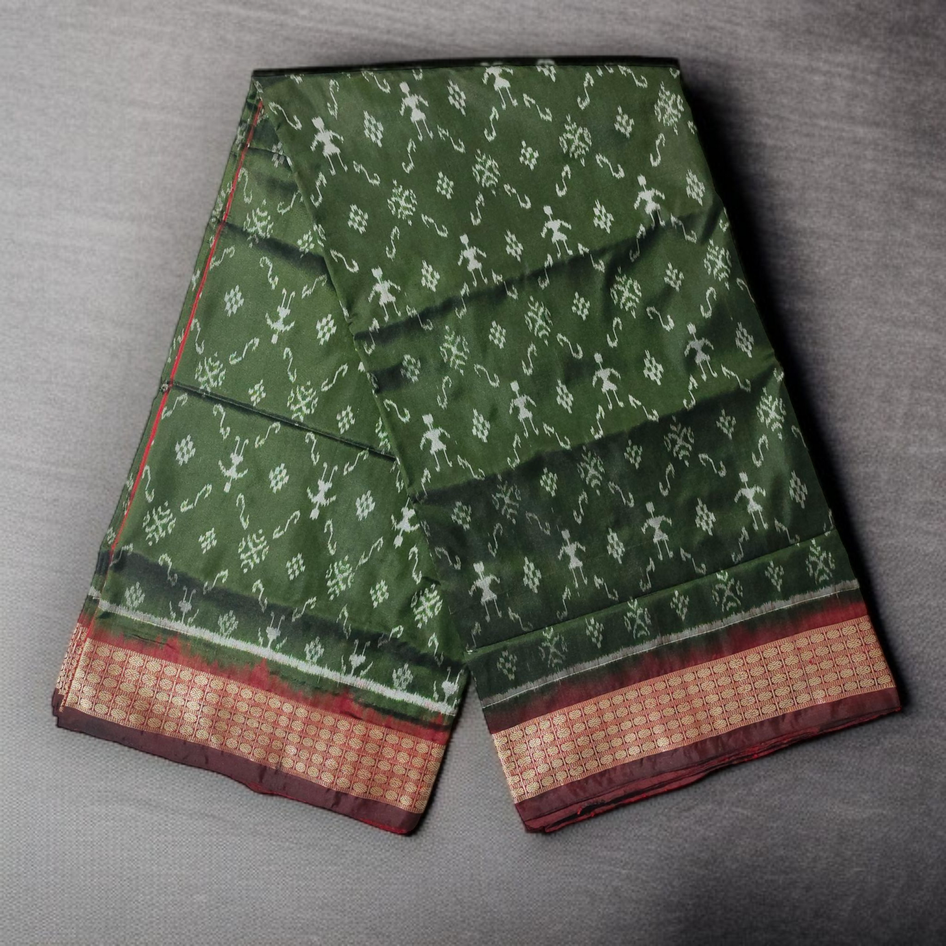 TSC Pure Bandha Silk Saree in Olive Green & Deep Maroon | Handwoven Sambalpuri Alpana & Tribal Motifs